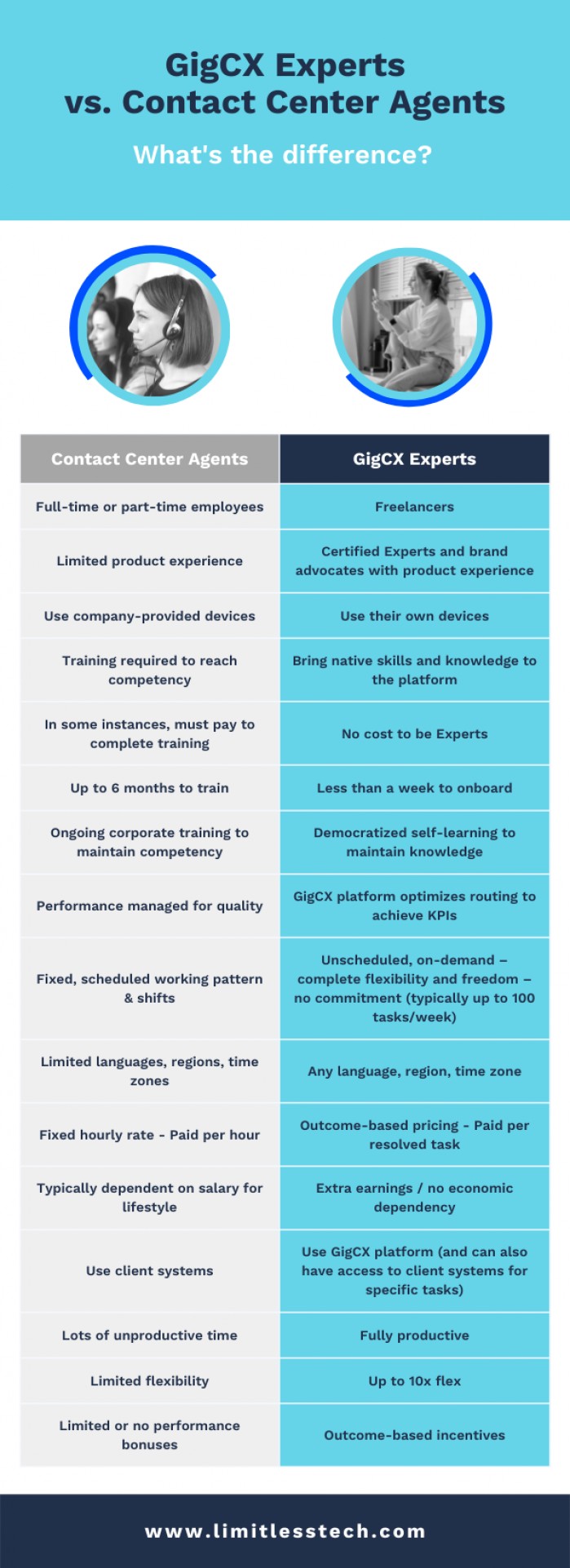 Here’s a quick overview of the differences between GigCX Experts and contact center agents: