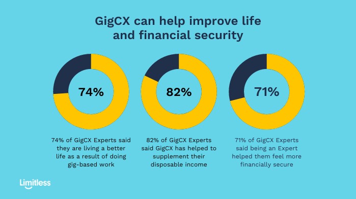 Becoming an Expert had positive personal and financial benefits for those we surveyed. Of those we surveyed, 71% said doing GigCX made them feel better about their financial security, 74% said they are living a better life as a result of doing gig-based work, and 82% said GigCX has helped to supplement their disposable income.