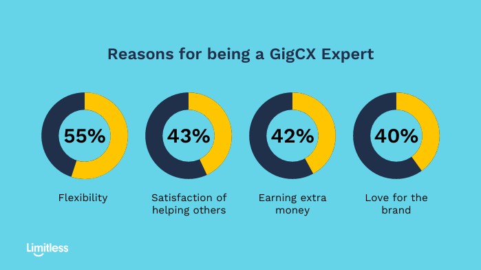 The reasons individuals decide to do GigCX vary greatly, but the top reason is the flexibility to earn money on their own time and schedule. More than half of Experts (55%) surveyed in this year’s report said flexibility was their top reason.