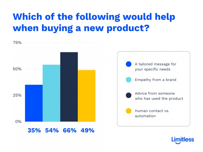 When considering a new product, 66% of consumers said first-hand advice from someone who has used the product (i.e., GigCX Experts) would help them decide when buying a new product or service, and 49% said human contact was preferred over a chatbot or machine.