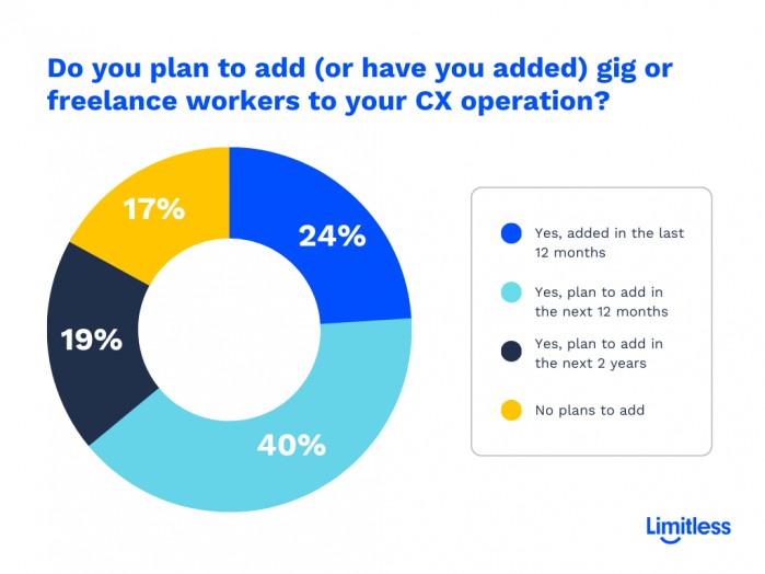 Over the past few years, awareness of and interest in GigCX from enterprises has trended upward, which continued into 2023. This year’s survey found that 83% of CX leaders have already added – or plan to add – gig or freelance workers to CX operations in the next two years, up from 72% in 2022.