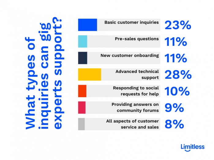 When asked what types of customer inquiries they felt gig or freelance workers could support, a quarter of CX leaders (28%) said advanced technical support (that requires secure access to customer data), up from 17% in 2022.